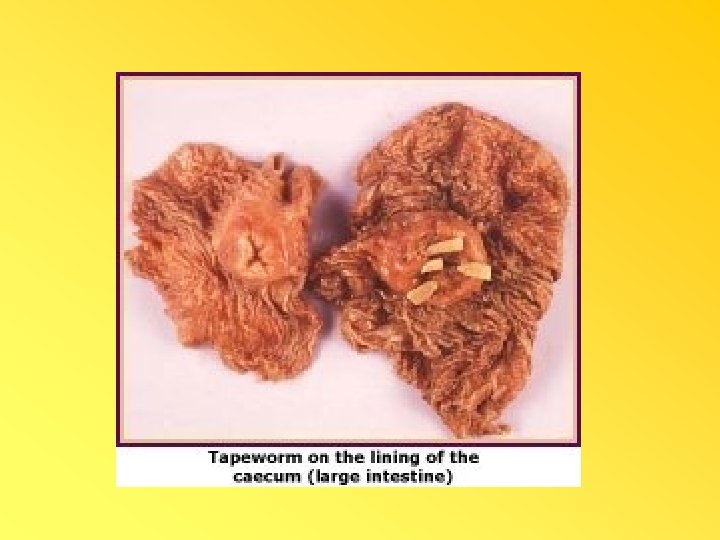 TISANOSOMIASIS Thysanosoma actinioides “Tenia festoneada” • Se encuentra en conductos biliares, pancreáticos y en el intestino delgado de ovinos, bovinos y venados. • Mide de 15 -30 cm por 8 mm de ancho. Escólex de 1. 5 mm • Proglótidos más anchos que largos y el cuello es muy corto. • El borde ventral de cada proglótido con festones de uno a otro extremo, cada segmento con dos pares de órganos sexuales.