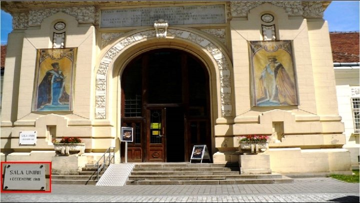 Sala Unirii din Alba Iulia Clădirea, care a adăpostit şedinţa din 1 decembrie 1918, în care cei 1228 de delegaţi au hotărât unirea Transilvaniei cu România, a fost ridicată în anul 1900, pe locul unui imobil în care a funcţionat o ospătărie având rolul unui cazinou militar, pentru militarii din armata austro-ungară staţionaţi în garnizoana cetăţii Alba Iulia. Imediat după Unire, edificiul a fost modificat pentru a i se da un aspect somptuos, pe măsura evenimentului ce l-a adăpostit. Între anii 1993 -1994 au avut loc ultimele intervenţii, când deasupra şemineelor a fost aşezată stema actuală a României, iar în sala interioară au fost aduse busturile regelui Ferdinand şi reginei Maria, creaţie a sculptorului Vlad Ciobanu. De asemenea, în această perioadă au fost refăcute şi fixate pe peretele vestic al sălii, plăcile în marmură cu textele rezoluţiei de Unire şi Legii pentru Unirea Transilvaniei, Banatului, Crişanei, Sătmarului şi Maramureşului cu România, votată de Parlamentul Ţării la 29 decembrie 1919. Sala Unirii a găzduit banchetele oficiale date cu ocazia Încoronării (15 octombrie 1922), Serbărilor Unirii (20 mai 1929) şi a dezvelirii Obeliscului Horea, Cloşca şi Crişan (14 octombrie 1937).