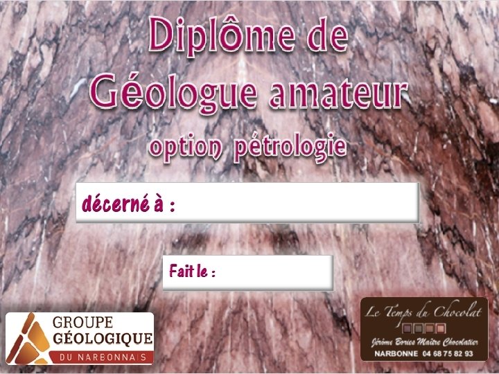 Cette animation se déroule en trois parties : Première partie 1. Explication géologique aux enfants : 2. Remise du questionnaire 3. Remise du fascicule complet (aide pour remplir 2. ) Deuxième partie 1. Les choco-roches explications 2. Réalisation Troisième partie 1. Remise du diplôme 2. Dégustation.