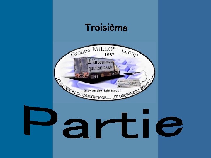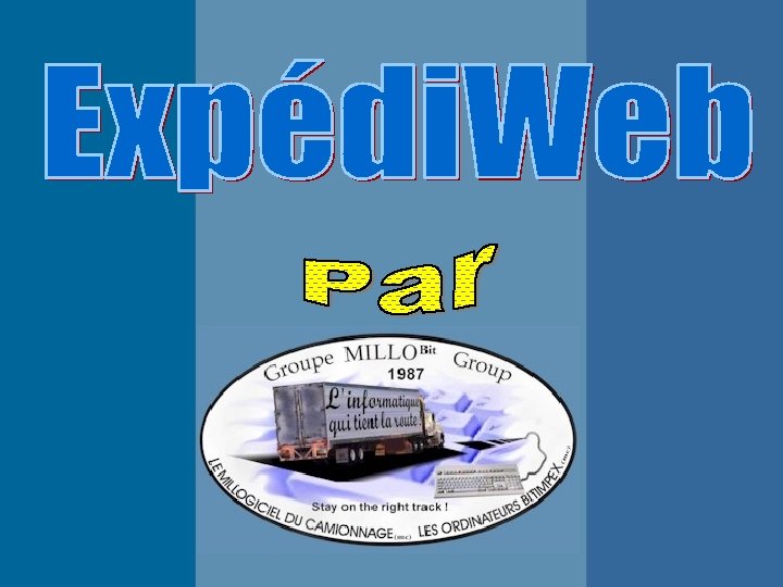 Cette présentation se passera en trois parties. Première partie : -Avantages et objectifs d’expédiweb*. Deuxième partie : -Utilisation du logiciel de prise de commande en ligne. Troisième partie : -Utilisation du logiciel de suivi des voyages en ligne. Le but de cette présentation est de vous familiariser avec ce nouveau module du Millogiciel du camionnage (mc). Ainsi nous espérons que vous allez apprécier les avantages d’Expédi. Web pour un meilleur rendement à votre travail. Alors, il ne nous reste plus qu’à vous souhaiter une agréable présentation. *Expédi. Web est le système de prise de commande en ligne intégré au Millogiciel du Camionnage.