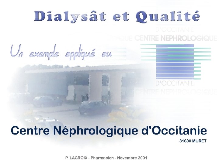 Le Centre Néphrologique d’Occitanie a débuté ses activités en juin 1991. La centrale de traitement d’eau actuelle, mise en place depuis 1997, alimente 6 jours sur 7 18 POSTES de DIALYSE Année 2000… 90 patients ont été dialysés (soit 13. 600 séances) 10% (9 patients) ont été traités par la technique d’hémodiafiltration (HDF) en ligne Nous effectuons, depuis l’ouverture du centre, des contrôles physico-chimiques, bactériologiques, ainsi que des recherches d’endotoxines sur l’eau et le dialysât : - afin d’assurer une production d’eau bi-osmosée conforme aux normes de la pharmacopée européenne (addendum 2000), - afin d’assurer également une production de dialysât et d’infusât adaptés à la technique HDF en ligne (depuis septembre 2000, et selon les recommandations des circulaires de juin 2000).