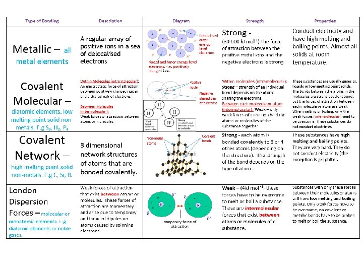 Summarising…… For each type of bonding you should make notes on the following; • A description of the bond e. g covalent bonds are shared pairs of electrons……. • A diagram of the bond. • The strength of the bond (this could be within the structure or between atoms or molecules. • The properties that arise from this type of bonding e. g metals can conduct electricity due to the freely moving electrons within the structure.
