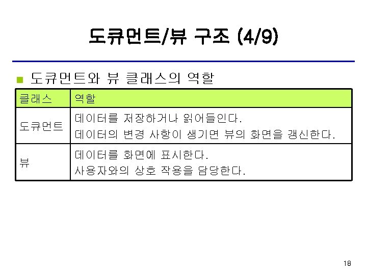 도큐먼트/뷰 구조 (8/9) n Init. Instance() 함수 BOOL CEx. File. App: : Init. Instance() {. . . CSingle. Doc. Template* p. Doc. Template; p. Doc. Template = new CSingle. Doc. Template( IDR_MAINFRAME, RUNTIME_CLASS(CEx. File. Doc), RUNTIME_CLASS(CMain. Frame), RUNTIME_CLASS(CEx. File. View)); Add. Doc. Template(p. Doc. Template); . . . } 22