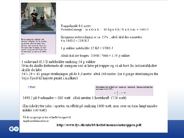Aktivitet • Du skal kunne udregne dit energiforbrug ved løb på trapper og fortælle hvor meget sukker du skal spise for at dække forbruget. • Du skal kunne regne ud hvor stor effekt du er i stand til at yde • Du skal kunne anvende/ forklare begreberne potentiel energi, kinetisk energi, kemisk energi, varmeenergi, effekt, joule, watt, hestekræfter • Udfordring: Hvor højt vil du kunne løbe op på én sodavand? • Perspektiv: Hvor meget energi forbrænder en elev i Kenya der må gå 6 km for at komme i skole?
