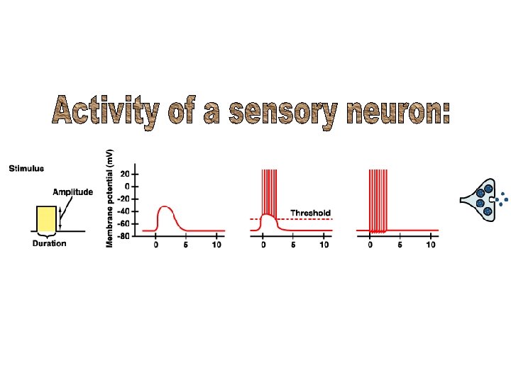 Transduction: • Convert stimulus energy to change in membrane potential (ions moving through channels) • Need an adequate stimulus for transduction (sensitivity) • Change in membrane potential is receptor potential (special senses) and generator potential (somatic senses)