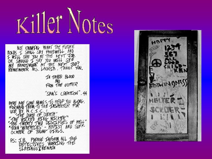 • lifestyle & oddities – fascinated w/ power & authority – religion – trophies – pride & arrogance Son of Sam Gacy