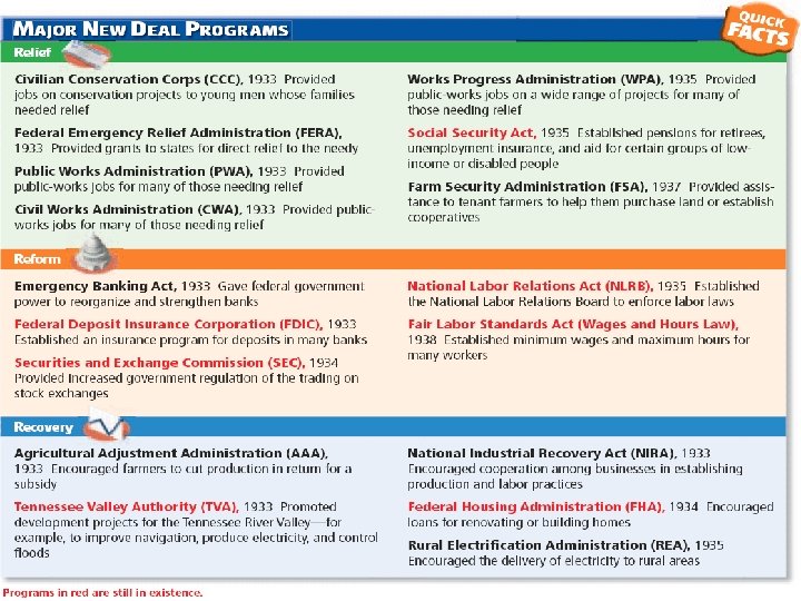 The 3 R’s of the New Deal Relief Recovery Reform • Relief for those suffering • Recovery of the economy • Programs and services in place to give financial, housing, and food help to those people suffering • Reform that would help prevent another economic crisis • Programs and Laws put in place to help businesses grow and prosper • Laws, Acts, and Regulations put in place to fix the problems that caused the Great Depression • Create jobs