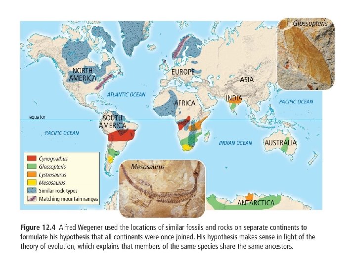 3. Matching fossils Fossils matching on continents that have an ocean separating them. Mesosaurus was a freshwater reptile found only in two places on Earth, southeastern South America and southwestern Africa. It was not likely it crossed an entire ocean. Other animals and plants have also been found spread apart on present day continents that is better explained if they were together Antarctica having tropical plants suggest that it was once near the equator and moved to south pole.