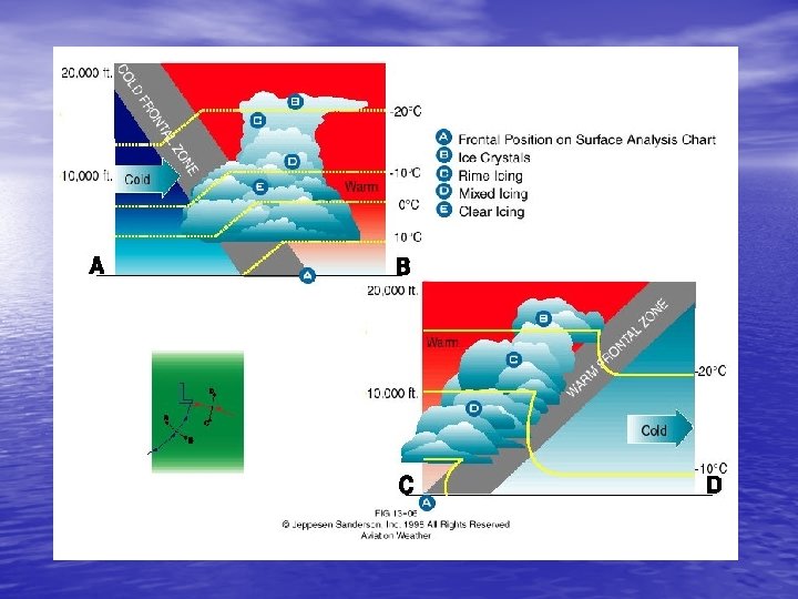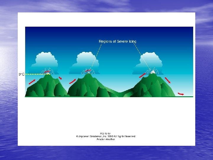 Ch 13 - Icing • Section D: Icing and Macro scale Weather Patterns – Cyclones and Fronts – extra tropical cyclones provide a variety of mechanisms to produce widespread, upward motions. These include convergence of surface winds, frontal lifting and convection. – Influence of Mountains – mountainous terrain should always be considered a source of icing hazards when subfreezing clouds are present. – Icing Climatology – refers to the average distribution of icing for a given area