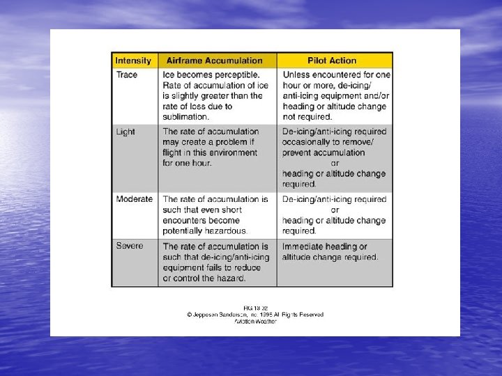 Ch 13 - Icing • Icing intensity – The severity of icing is determined by its operational effect on the aircraft. – Icing intensity is classified as trace, light, moderate and severe and is related to • rate of accumulation of ice on the aircraft • the effectiveness of available de-icing/anti-icing equipment • and the actions you must take to combat the accumulation of ice.