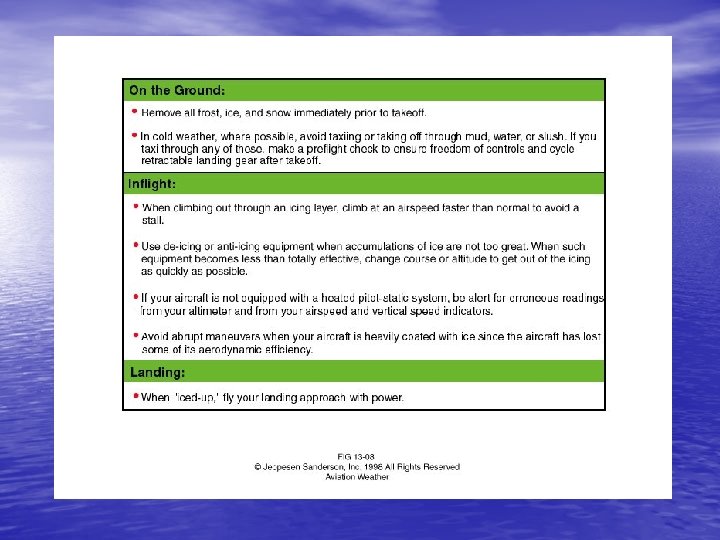 Ch 13 - Icing • Summary - Finally, on the basis of icing causes and characteristics, a number of practical rules of thumb have been established to help you avoid or at least minimize icing effects - Keep in mind that these are general guidelines; they have not directly addressed the capabilities of your aircraft to handle icing situations
