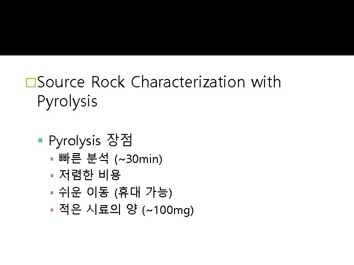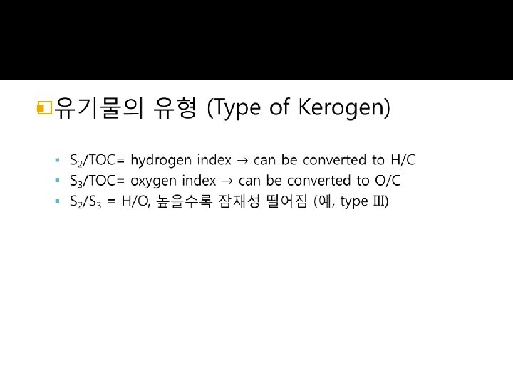�Pyrolysis로부터 석유 발생 잠재성 (oil generation potential) 유기물 유형 (organic matter type) 열적 성숙도 ( thermal maturity)
