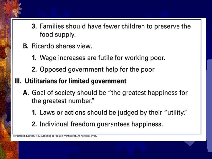 David Ricardo • An influential British Laissez-faire supporter who did not believe there was hope for the poor working class. • He wrote “Iron Laws of Wages” in which he said a wage increase would not increase the standard of living for the poor because they would just have more children.