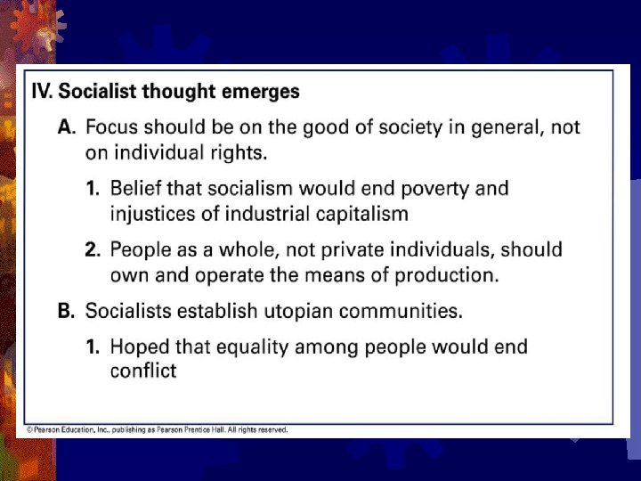 Socialism Develops Opposite Laissez-faire • Laissez-fair focused on individual rights while socialists focused on the good of society in general. • Under socialism the people as a whole rather than private individuals would own the means of production, which would solve poverty. • Grew out of the Enlightenment faith in progress and human nature and its concern for justice.