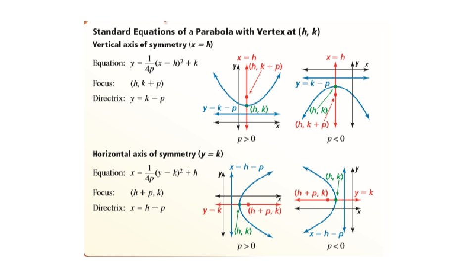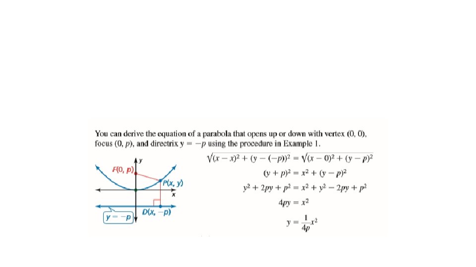 How else can a parabola be defined? • Previously, you learned that the graph of a quadratic function is a parabola that opens up or down. • A parabola can also be defined as the set of all points (x, y) in a plane that are equidistant from a fixed point called the focus and a fixed line called the directrix.