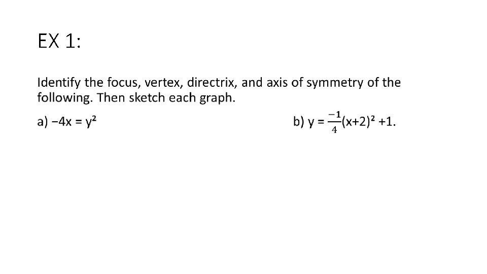 You Try! Identify the focus, directrix, and axis of symmetry of each of the following. Sketch the graph. a − 2 x = y² b) y = (x+3)²-5