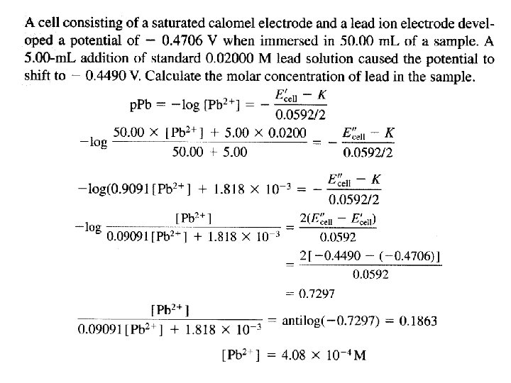 Mercury : indicator electrode of second kind for the EDTA anion Y 4 -. When a small amount of Hg. Y 2 - is added to a solution containing Y 4 -, the half-reaction of a Hg electrode Formation constant for Hg. Y 2 - : very large(6. 3*1021) ☞ the concentration of the complex remains essentially constant over a large range of Y 4 -. where 3) Inert metallic electrode for redox systems(Pt, Pd, Au, C etc. )