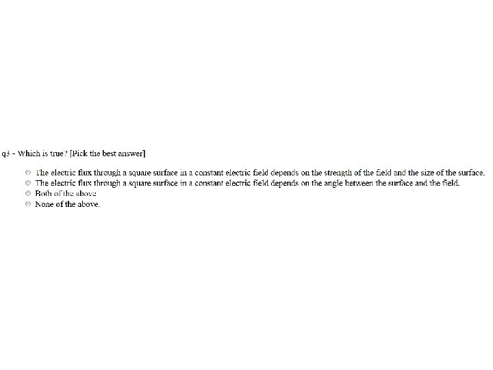 Total Flux Out of Various Shapes A point charge q is at the “center” of a (a) sphere (b) joined hemispheres (c) cylinder. What is the total electric flux out of the shape? b a q q a q