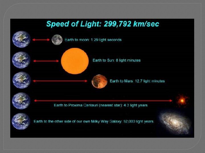 • 2. Distance is measured in light-years – the distance light travels in a year. • Extra cool facts: �Light travels 186, 000 miles/sec or ~ 300, 000 meters/sec �Diameter of Earth = 7, 926 miles…so, light can travel about the distance of 23 Earth’s in 1 second