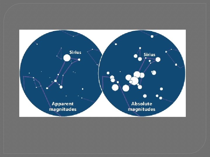 � B. Star magnitude • 1. Absolute magnitude – measure of the amount of light a star actually gives off • 2. Apparent magnitude – measure of the amount of a star’s light received on Earth