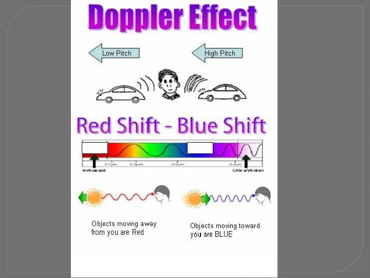 � D. Universe is expanding • 1. Doppler Shift – light changes as it moves toward or away from an object �a. Starlight moving toward Earth shifts to blue-violet end of spectrum �b. Starlight moving away from Earth shifts to red end of spectrum