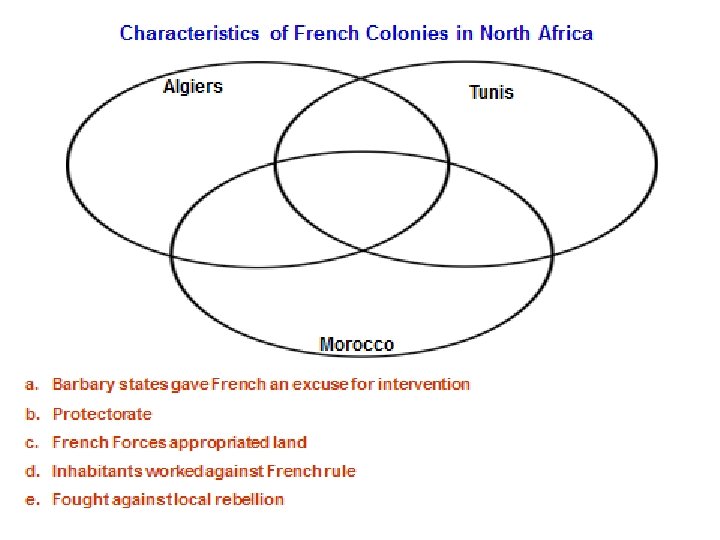 French in North Africa § 1830: Algiers, however they were not welcomed & fought for about 40 years § 1881: Fr took mil action vs. Tunis (sm country to east of Algiers) for little/no reason—and took it over as a protectorate § 1904: Fr made agreement w/ Spain, Italy, & GB to take over Morocco as long as they left Egypt (GB) & Libya (Italy) alone. § Spain was allowed a sphere of influence in N. Morocco to trade only § 1909 Morocco became a Fr. protectorate