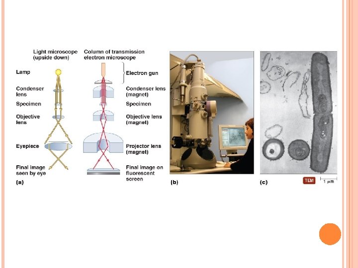 FIGURE 3. 10 ATRANSMISSION AND SCANNING ELECTRON MICROSCOPY. Electron gun Electron beam Electromagnetic condenser lens Specimen Electromagnetic objective lens Electromagnetic projector lens Fluorescent screen or photographic plate Viewing eyepiece Transmission. (Left) In a transmission electron microscope, electrons pass through the specimen and are scattered. Magnetic lenses focus the image onto a fluorescent screen or photographic plate. (Right) This colorized transmission electron micrograph (TEM) shows a thin slice of Paramecium. In this type of microscopy, the internal structures present in the slice can be seen.