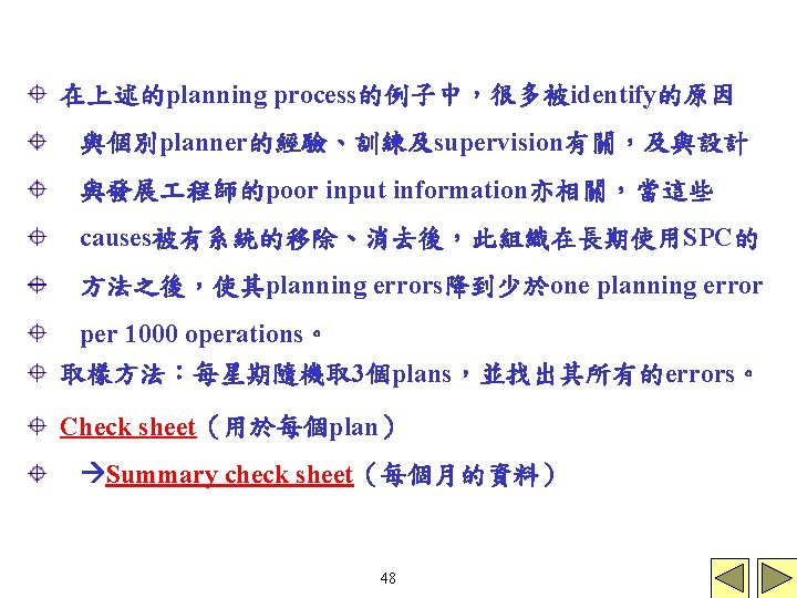 可採用step-down的approach。 e. g. 對每個block(如:planner, check…)再加以細分 其 作項目。. 該planning organization的經理決定以“減少planning errors”為其改進品質的目標。 由下列人員組成一個小組: managers, planners, and checkers。 47