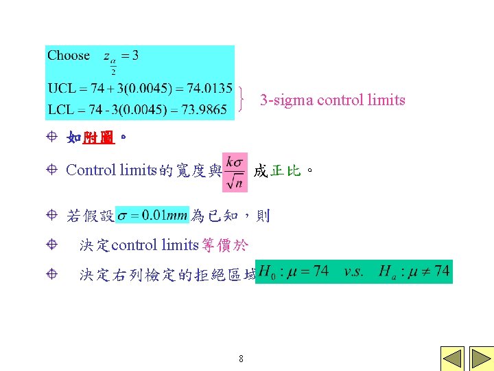 E. g. Piston-ring的直徑 Process average = 74 mm( ) Process standard deviation = 0. 01 mm( ) Sample size = 5 (n) Sampling frequency = every hour Assume ~ Normality distributed About of the sample diameters will fall between 7