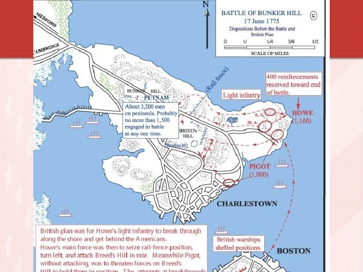 • After the Battles of Lexington and Concord, the two armies faced off in Boston • "Don't fire until you see the whites of their eyes. “ • Battle of Bunker Hill was fought on Breed’s Hill