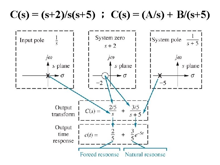 4. 2 Poles, Zeros, and System Response • T. F. = G(s) = (s+2)/(s+5) • Fig. 4. 1 C(s) = (s+2)/s(s+5) C(s) = (A/s)+B/(s+5) = (As+5 A+Bs)/s(s+5) C(t)=Cf(t)+Cn(t) pole 越左 系統反應越快 zero 影響系統振幅
