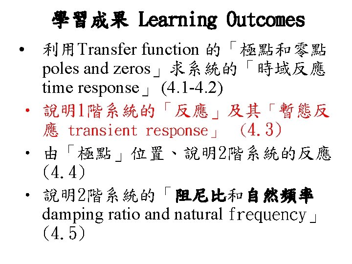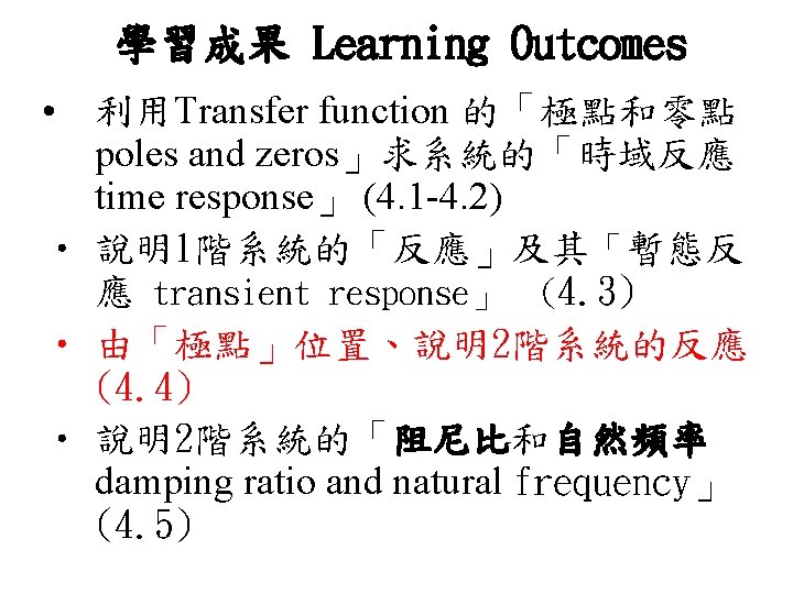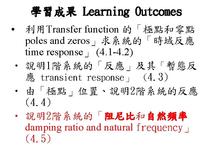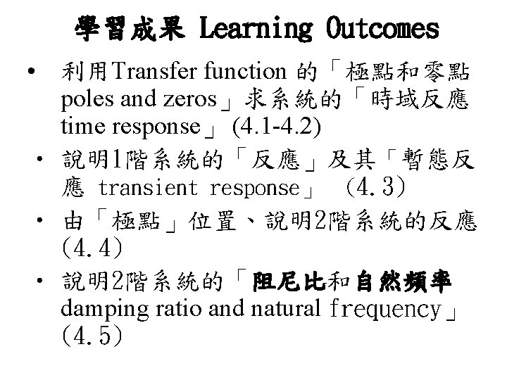 4. 5 The General Second-Order System • 1階系統之反應由 time constant 決定 2階系統之反應由 ωn and ζ決定 • Natural frequency ωn ωn≡ frequency of oscillation when system damping set to zero • Damping ratio ζ (Zeta) ζ≡ exponential decay frequency / natural frequency ≡ σ1 / ωn