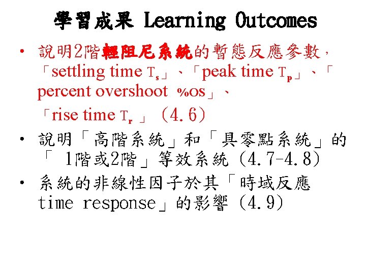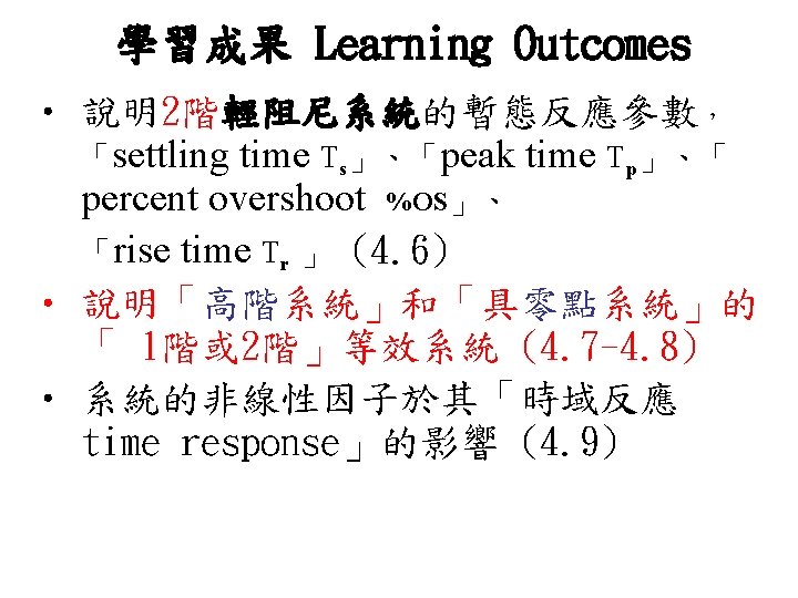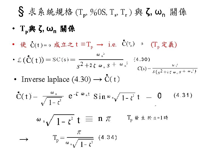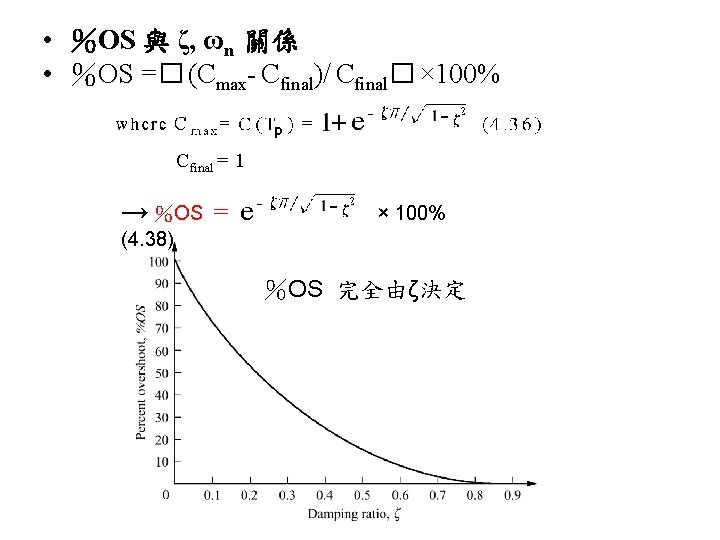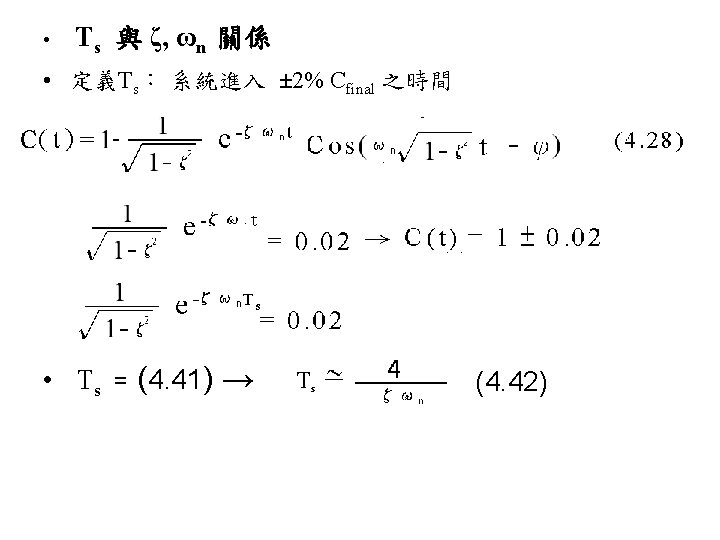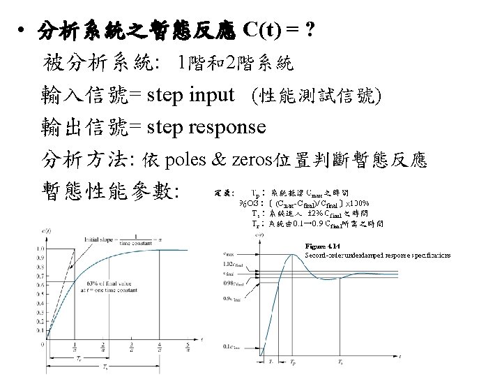 定義: Tp: 系統抵達 Cmax 之時間 %OS:� (Cmax- Cfinal)/ Cfinal� × 100% Ts:系統進入 ± 2% Cfinal 之時間 Tr:系統由 0. 1→ 0. 9 Cfinal所需之時間 Figure 4. 14 Second-order underdamped response specifications