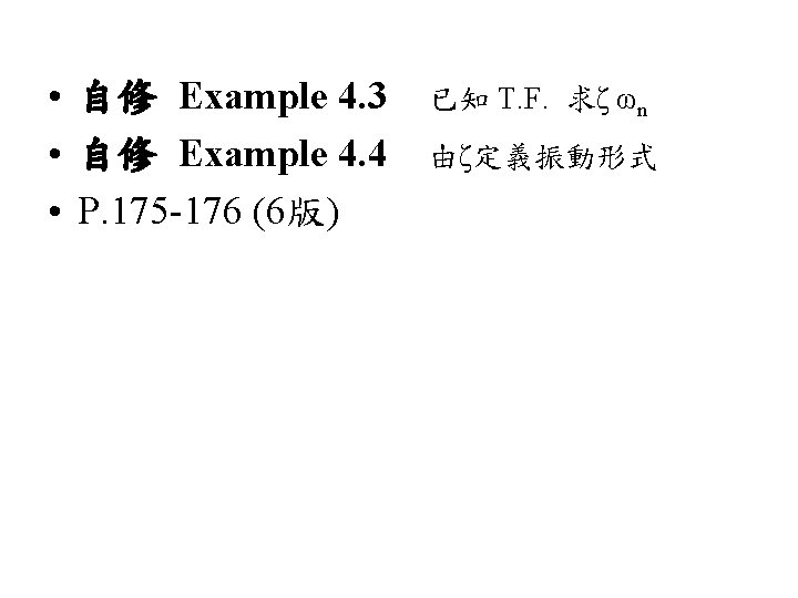 • Ex. 4. 5 self study p. 196 • 由 pole 在 s-plane 之位置找 ζ, ωn Poles S 1, 2 = ωd:damped frequency of oscillation ζωn=σd exponential decay frequency ζ= cosθ