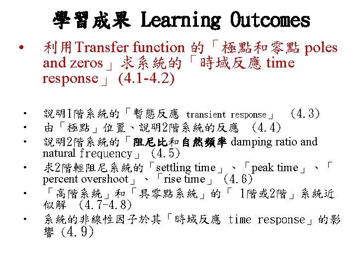 Figure 4. 5 系統反應由time constant完全決 定 (i. e. 系統規格 ) C(t) = 1 - e-at r(t)=1 定義暫態反應參數: time constant rise time settling time