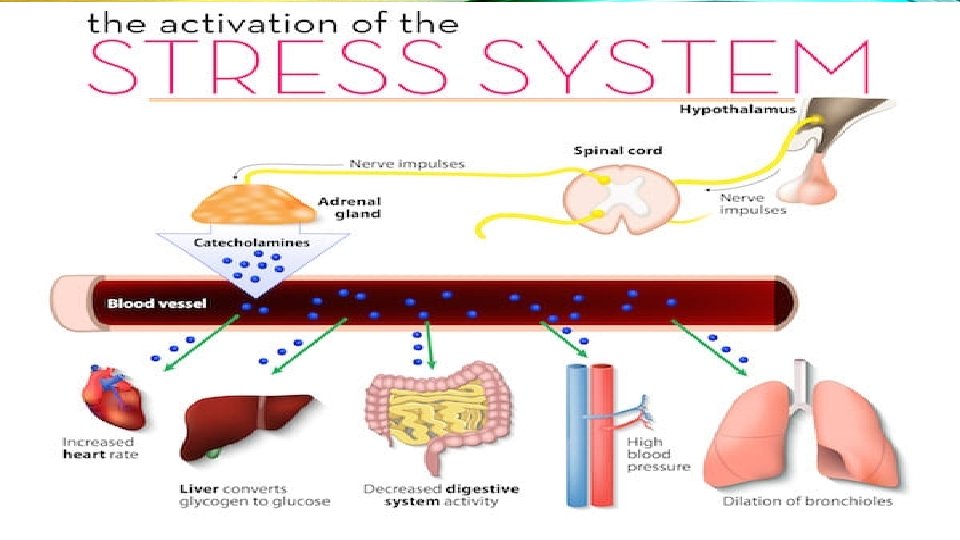 YOUR BODY’S RESPONSE TO STRESS • When you perceived something to be dangerous, difficult, or painful, your body automatically begins a stress response Recognize the problem Body begins to fight off the stress (adrenaline rush) When body begins to break down