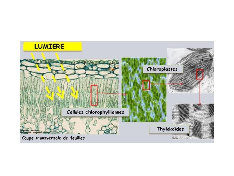 Au niveau des feuilles La lumière, plus précisément l'énergie portée par les radiations lumineuses, est captée au niveau des molécules de chlorophylle; cette molécule est intégrée dans la membrane des thylakoïdes, éléments constitutifs des chloroplastes, organites présents dans les cellules chlorophylliennes de la feuille (cellules du parenchyme palissadique et du parenchyme lacuneux).