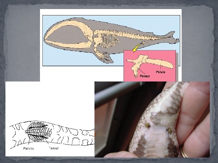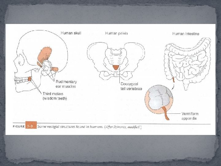 � 3. Vestigial structures – structures that don’t seem to have a function but might have once functioned in an ancestor. �Examples: �Manatees, snakes, and whales do not have legs – however, they still have pelvic bones �Human appendix serves no purpose – however, similar to cecum which is found in many mammals