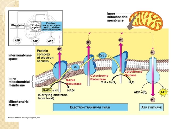 ETC �Electrons from NADH and FADH 2 from glycolysis and the Krebs Cycle lose electrons, proton gradient �The energy in each NADH molecule moves enough protons (H+) into the mitochondrial matrix to create 3 ATP � 1 FADH 2 2 ATP