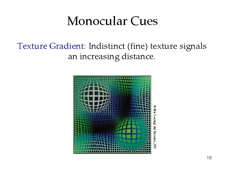 Monocular Cues Texture Gradient: Indistinct (fine) texture signals an increasing distance. © Eric Lessing/ Art Resource, NY 19