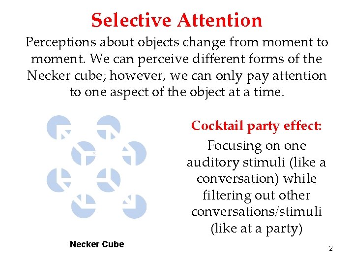 Selective Attention Perceptions about objects change from moment to moment. We can perceive different forms of the Necker cube; however, we can only pay attention to one aspect of the object at a time. Cocktail party effect: Focusing on one auditory stimuli (like a conversation) while filtering out other conversations/stimuli (like at a party) Necker Cube 2
