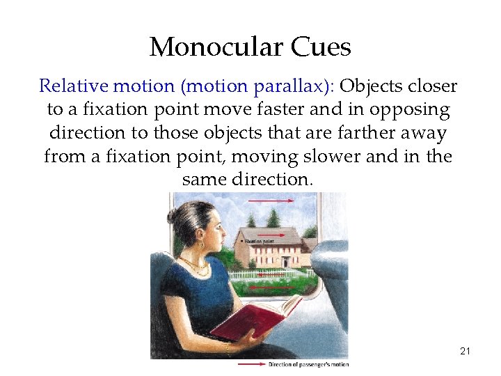 Monocular Cues Relative motion (motion parallax): Objects closer to a fixation point move faster and in opposing direction to those objects that are farther away from a fixation point, moving slower and in the same direction. 21