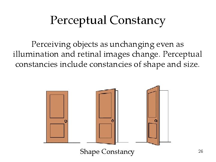 Perceptual Constancy Perceiving objects as unchanging even as illumination and retinal images change. Perceptual constancies include constancies of shape and size. Shape Constancy 26