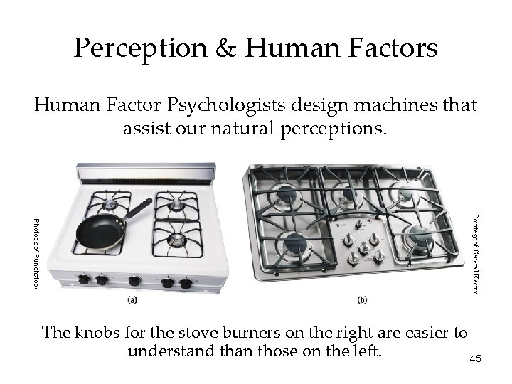 Perception & Human Factors Human Factor Psychologists design machines that assist our natural perceptions. Courtesy of General Electric Photodisc/ Punchstock The knobs for the stove burners on the right are easier to understand than those on the left. 45
