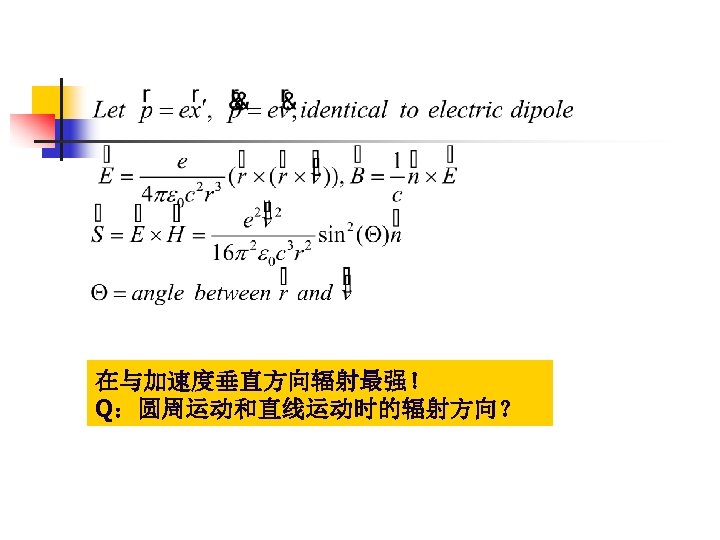 Bremsstrahlung and Synchrotron radiation Acceleration is parallel to velocity (轫致辐射) Angular distribution Radiation power where