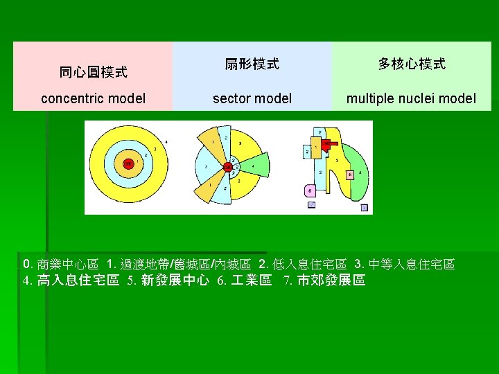 3. The five functional zones in Burgess model § § § Central Business District (CBD) or loop Zones in transition Working men’s residential zone Middle class residential zone High class residential zones/ commuters zone