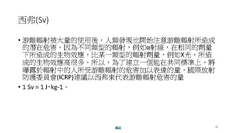 Biological systems • Biological effects (RBE) of High-Z and High-Energy particles (HZE) and high linear energy transfer (LET) • HZE: 高(H)原子序數(Z)和能量(E)粒子 • LET: In dosimetry, linear energy transfer (LET) is the amount of energy that an ionizing particle transfers to the material traversed per unit distance. • Radiation • Low-gravity • Cancer https: //en. wikipedia. org/wiki/HZE_ions https: //en. wikipedia. org/wiki/Linear_energy_transfer 48