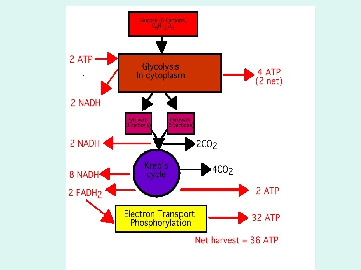Summary of Cellular Respiration • Glucose is split into _________ in the cytoplasm • In the mitochondria, the _______ makes CO 2 and NADH and FADH • __________ makes ATP on the inner membrane of the mitochondria • Oxygen and hydrogen make water • Total – 36 ATPs made by aerobic resp.
