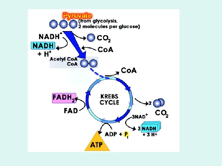 The Krebs Cycle • In the matrix of the mitochondria • Pyruvic acid enters the cycle, where a series of enzyme-controlled reactions create NADH and FADH (energy carriers) • Carbon dioxied (CO 2) is a waste product