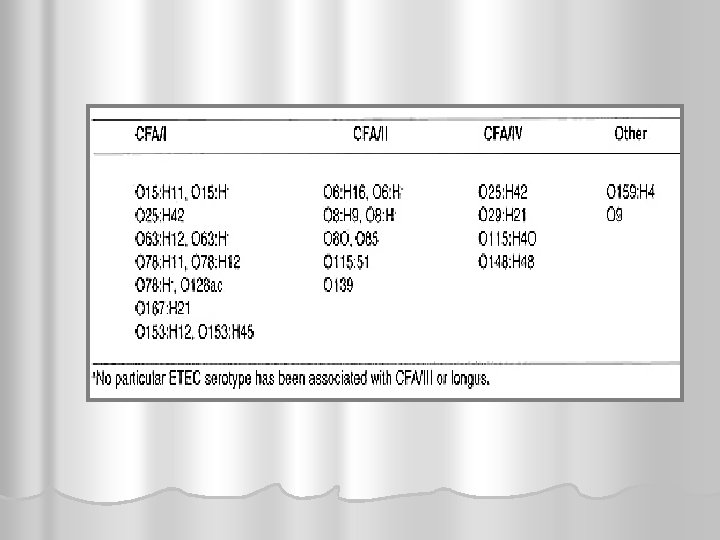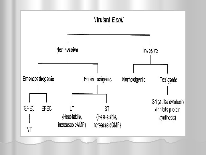 Escherichia coli Diarrhea-producing E. coli Virulence Factors Enteroroxigenic E. coli Heat-labile toxin (LT) Heat-stable toxin (ST) Colonization factors (fimbriae) Enterohernorrhagic E. coli Shiga like toxin (SLT-I) Shiga like toxin II (SLF-II) Colonisation factors (fimbriae) Enteroinvasive E. coli Shiga like toxin (SLT-I) Shiga like toxin II (SLF-II) Ability to invade epithelial cells Enteropathogenic E. coli Adhesin factor for epithelial cells Urinary trace infections P- fimbriae Meningitis K-1 capsule